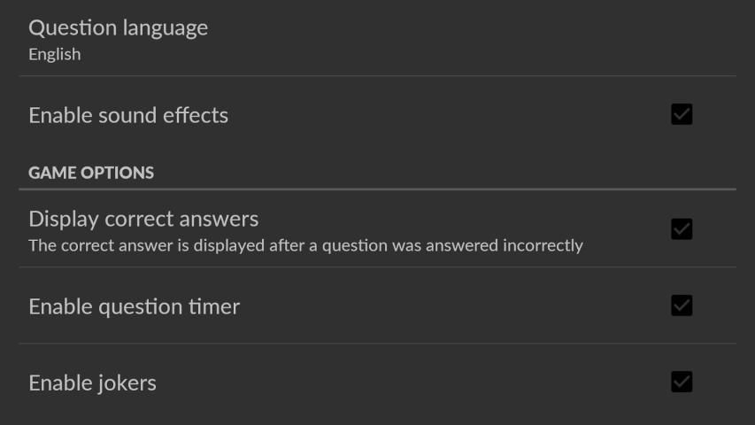 عبر عنصر القائمة "خيارات"، يمكنك ضبط الإعدادات المختلفة. بين ويمكن تشغيل مؤثرات صوتية أو إيقاف تشغيله الآخرين، فمن الممكن لتحديد لغة السؤال وعرض الإجابات الصحيحة يمكن تعديلها.