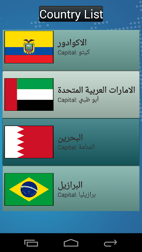 * قائمة البلدان: قائمة بأسماء جميع الدول وعواصمها. تصل إلى مقالة ويكيبيديا عن كل بلد.