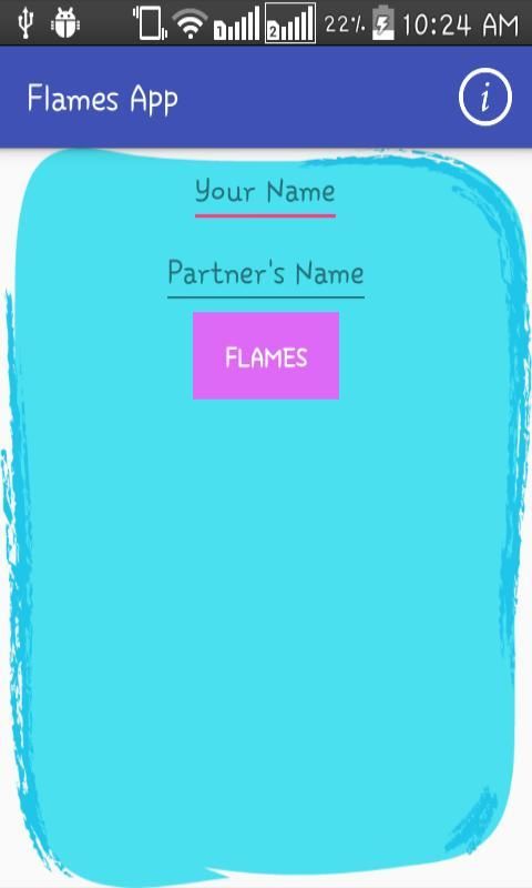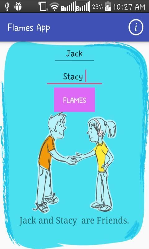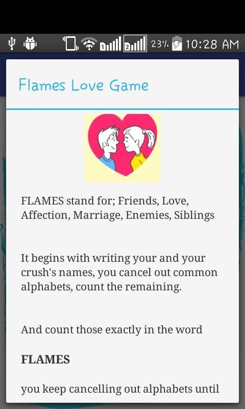 FLAMES letters stand for: F- Friends, L- Love, A- Affection, M- Marriage, E- Enemies, S- Sibling FLAMES app is a game that is the way of finding compatibility between two persons based on their names.