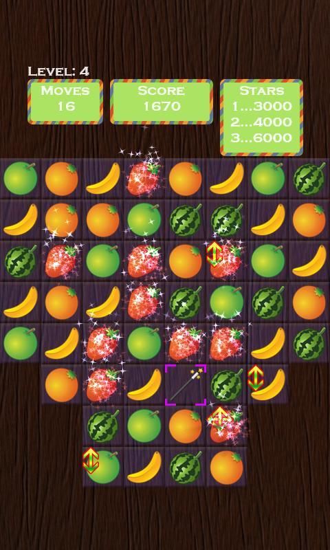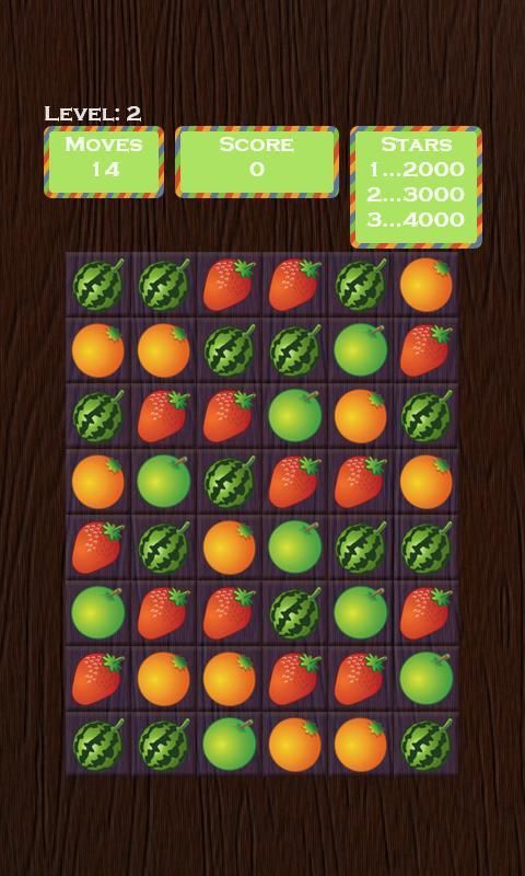 المباراة 3 في صف واحد أو أكثر لإزالة الفاكهة.