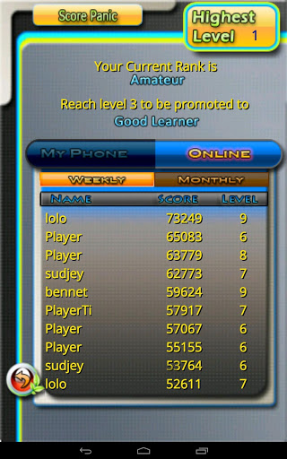 النتائج عبر الإنترنت! يتم سرد العشرات من أفضل عشرة لاعبين من جميع أنحاء العالم في علامات التبويب الأسبوعية والشهرية في شاشة النتائج عبر الإنترنت في أي وقت ، يمكنك التنافس مع أفضل عشرة محرزين أسبوعيًا وشهريًا وإرسال نتائجك بعد كل مباراة.
