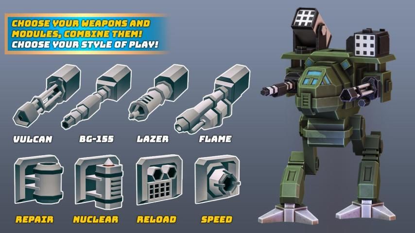 - العديد من التوليفات الممكنة من الروبوتات والأسلحة. إنشاء آلة الحرب لتناسب أسلوب اللعب الخاص بك!