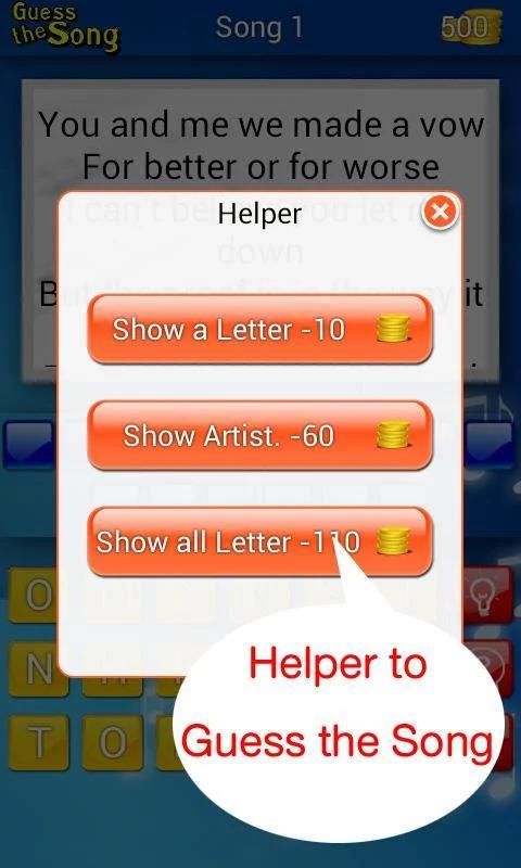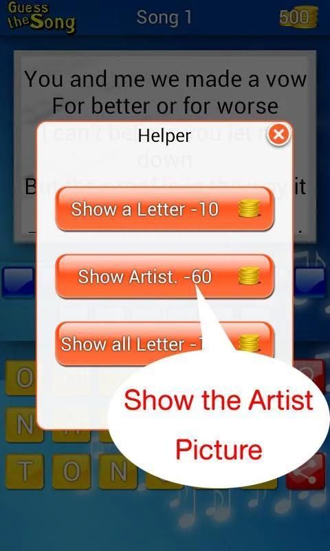 دعونا تخمين أغنية تلميح لإظهار الفنان أو الأغنية اسم واستخدام مساعد لإظهار الرسائل، صورة الفنان، وعرض كل اسم الأغنية.