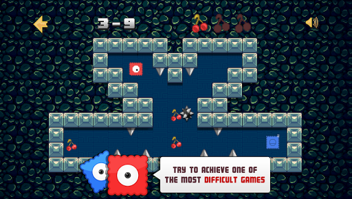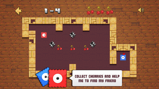 Move the red square with the big eye, collect the three cherries on each level and wake up the blue square!