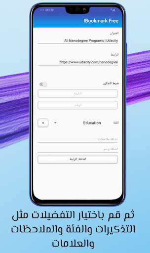 1- لأضافة أي رابط الي IBookmark من تطبيقات مثل Chrome أو Firefox أو Opera أو YouTube. ما عليك سوى اختيار خيار المشاركة من تطبيقك واختيار IBookmark من قائمة التطبيقات. ستظهر نافذة جديدة بالخيارات المتاحة مثل إعداد تذكير ، وإضافة رابطك إلى فئة المخصصه للتنظيم. ويمكنك اختياريًا إضافة ملاحظة أو وسم لجعل الأمر أكثر سهولة بالنسبة لك للبحث عن روابطك.