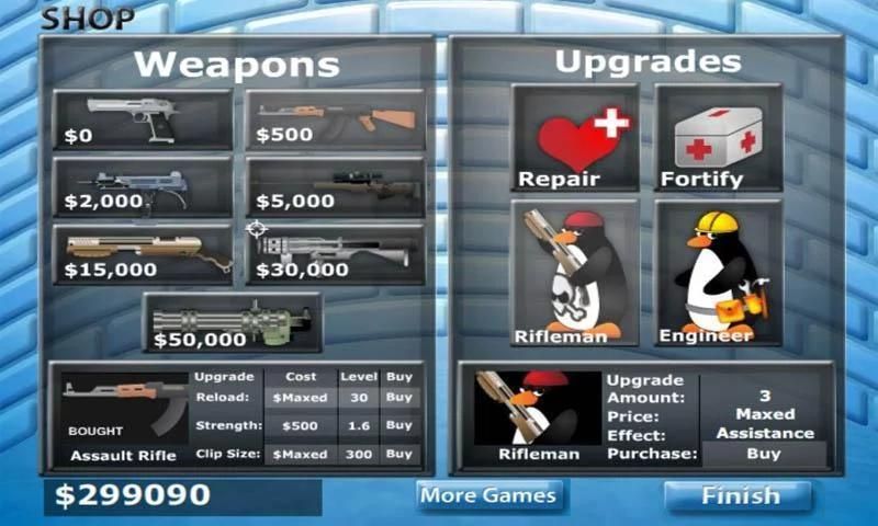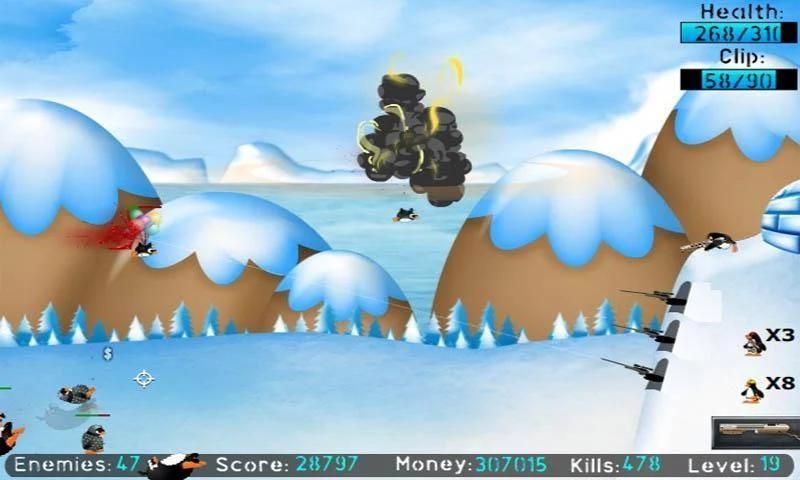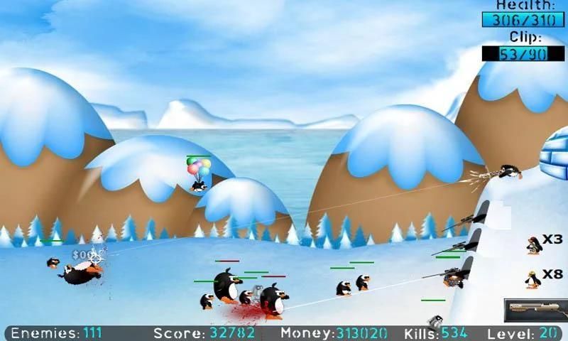 This is a very cool strategy game - go through the in-game instructions before you play! Defend your igloo and keep shooting the penguins with bigger and better guns. Will all of your growing firepower and fellow penguin gunmans be enough to keep all those curious penguins away from the igloo?