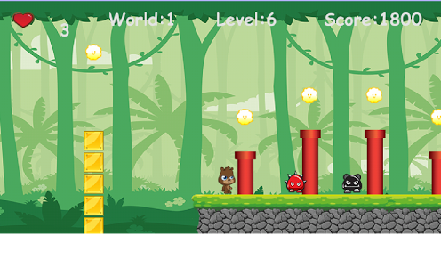 Jungle Bear Adventure this fun and amazing adventure game is better than ever and will surely be what you are looking for. Like side scrolling adventure that will rock you through 18 levels of challenging running and jumping. This retro-gaming classic will turn your Jungle Bear Adventure- loving heart on end! To play you simple touch the screen to jump and touch quickly twice to double jump. You can jump over your enemies to kill them and your goal is to guide Jungle Bear to the end. Download Jungle Bear now! It is a fun game for everyone. Try it out and enjoy!