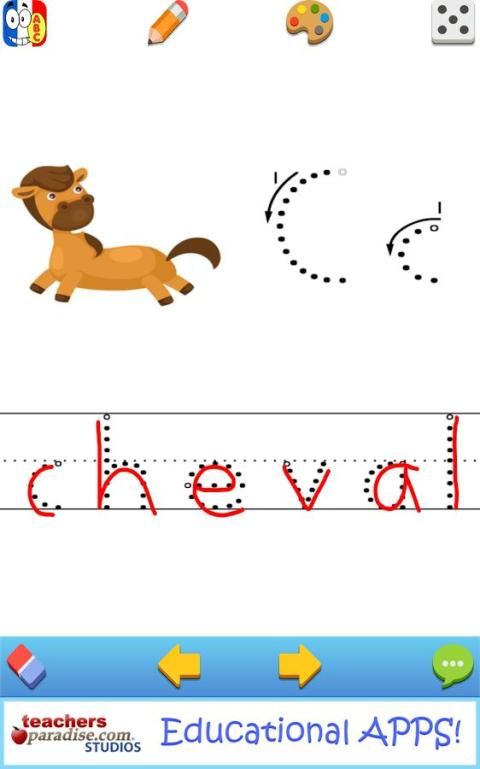 تعلم القراءة والكتابة باللغة الفرنسية أثناء ممارسة الكتابة اليدوية سوف تتوسع الفرنسية المفردات والحروف الأبجدية المعرفة طفلك. تبدأ المتعلمين الخاص بك قليلا على خط اليد المرح مع البطاقات التعليمية لمساعدة طفلك على تعلم أن A هو لأبيلي وB هو لبالون. رؤية وسماع الرسالة، وسوف صورة تمثل كل حرف تساعد طفلك على تعلم اللغة الجديدة. تواصل مع أربعة خيارات الممارسات التي تسمح لك لاختيار مستوى الصعوبة. ممارسة البحث عن المفقودين وكتابة الأحرف الكبيرة والصغيرة الفرنسية، تتبع المفردات الفرنسية ثم العمل لمدة تصل إلى كتابة كلمات كل من تلقاء نفسها. والصور الملونة التي تمثل كل حرف تساعد طفلك المنتسبين الكائن مع الحروف الأبجدية. هذه اللعبة التعليمية توفر نطق أسماء جميع الصور والرسائل باللغة الفرنسية. دسيسة اصغر الكتابة اليدوية تعليم المتعلم دون ورقة أثناء ممارسة الطريقة الصحيحة لكتابة كل حرف وكلمة باستخدام خط اليد بدون Tears® المخطوطة. لا حاجة للأقلام فوضوي أو أقلام الرصاص unsharpened هذه اللعبة التعليمية توفر متعة لا نهاية لها على خط اليد.