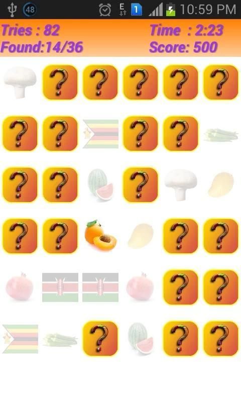 سيتم مدغدغ الخلايا العصبية في المخ الخاصة بك كما التعقيد إلى زيادات اللعبة. يمكنك استخدام 4 مواضيع مختلفة من اللعبة، مثل الأعلام / الفاكهة / الخضار / إجمالي المزيج. هذه اللعبة سوف تساعد أيضا ابنك على تعلم أيضا الأعلام المختلفة والفواكه والخضروات.