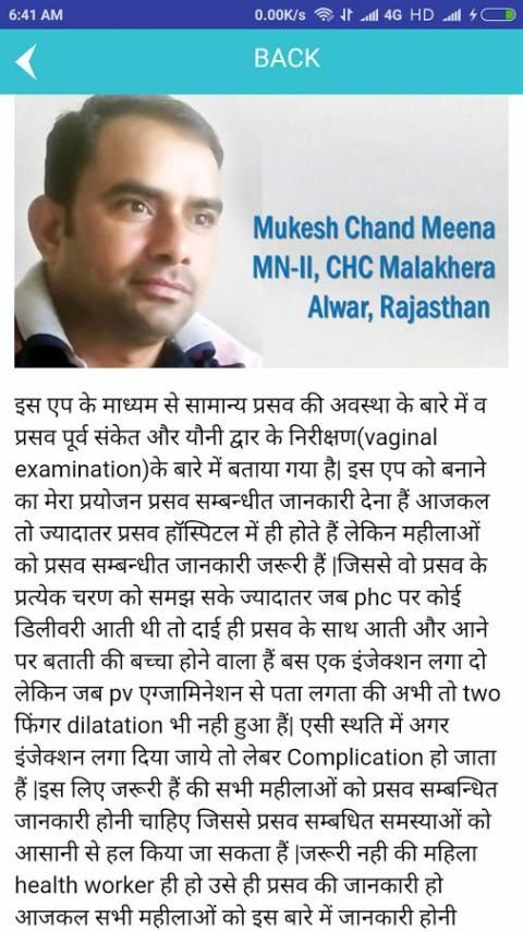 من خلال هذا التطبيق الذي حول حالة الولادة الطبيعية وقبل الولادة تراقب إشارة وبوابة يوني (الفحص المهبلي) وقد علم | هدفي في جعل هذا التطبيق تسليم Sambndhit إعطاء معلومات، لكن في الوقت الحاضر، تحدث معظم الولادات في المعلومات مستشفى النساء الولادة ضرورية Sambndhit | حتى يتمكنوا من فهم كل مرحلة من مراحل التسليم، ومعظمهم عندما جاءت القابلة تسليم الرعاية الصحية الأولية على مع ولادة الطفل سوف يأتي واقول لكم حقنة واحدة فقط في الفكر واثنين ولكن الفحص الكهروضوئية يبدو أن تعرف فقط ما فعله اثنين ولا حتى إصبع توسع | يجب أن يكون هذا ضرورية لإيصال المعلومات المتعلقة النساء في جميع القضايا العمالية ذات الصلة يمكن حلها بسهولة | | AC مرحلة إذا كان الحقن هو يطرح للمضاعفات العمل لا يكون بالضرورة نفس العاملين الصحيين امرأة الجميع يدرك التسليم على النساء أن يكون على بينة من هذا، وينبغي الحصول على مزيد من ما يزيد على تسليم مستشفى | يأملون هذا التطبيق تكون مفيدة في ايصال المعلومات Sambndhit |