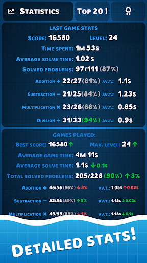 في وضع اللعبة ، سيتعين عليك إظهار جميع مهاراتك الحسابية وجداول الأوقات لحل مشاكل الرياضيات في الإضافة والطرح والضرب والقسمة.أي لعبة رياضية تدرب مهارات الحساب.ولكن عندما يكون الوقت المحدود لحل المشكلات محدودًا ، ترتفع هذه المهارة على مستوى أعلى.كلما زادت مشاكل الرياضيات التي تحلها ، زادت صعوبة المشكلات الجديدة.بعد كل لعبة رياضيات ، سترى جدول إحصائيات مفصلة مع بيانات مهارات الرياضيات الخاصة بك.أو يمكنك مقارنة نتائجك مع قادة الرياضيات في جميع أنحاء العالم.