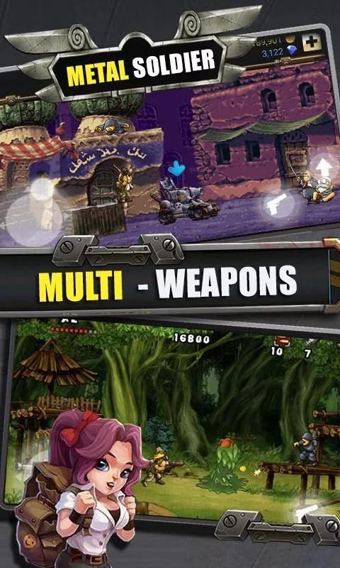 مطلق النار المعدن هو تماما على غرار منصة العمل لعبة 2D اطلاق النار، سوف تصبح جندي ومساعدة الحضارة وجمع البنادق، bullets.through العديد من ساحات القتال، واسقاط الجيش Maddog، ووضع حد لها عن طريق ضربة قاتلة، والأسلحة ومكافحة الروبوت.