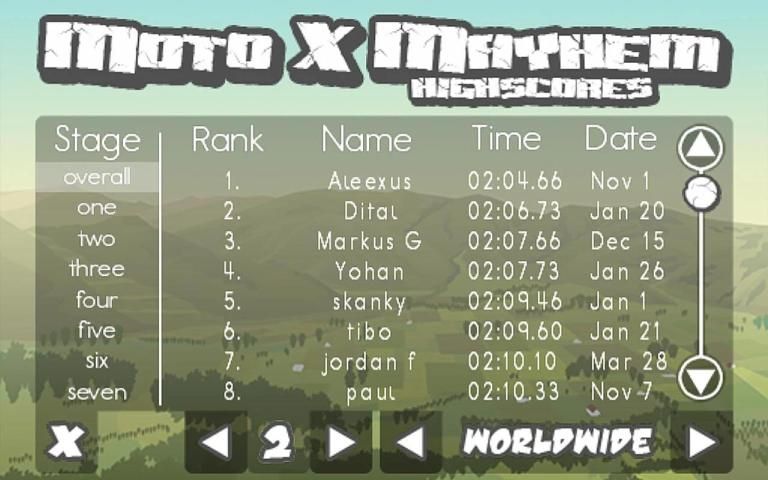 Use accelerometer technology to balance as you climb and fly over huge jumps! Enjoy realistic physics as your shocks recoil when you land or your rider bounces around when you crash. Compete to be the fastest rider with Moto X Mayhem's advanced highscore system.