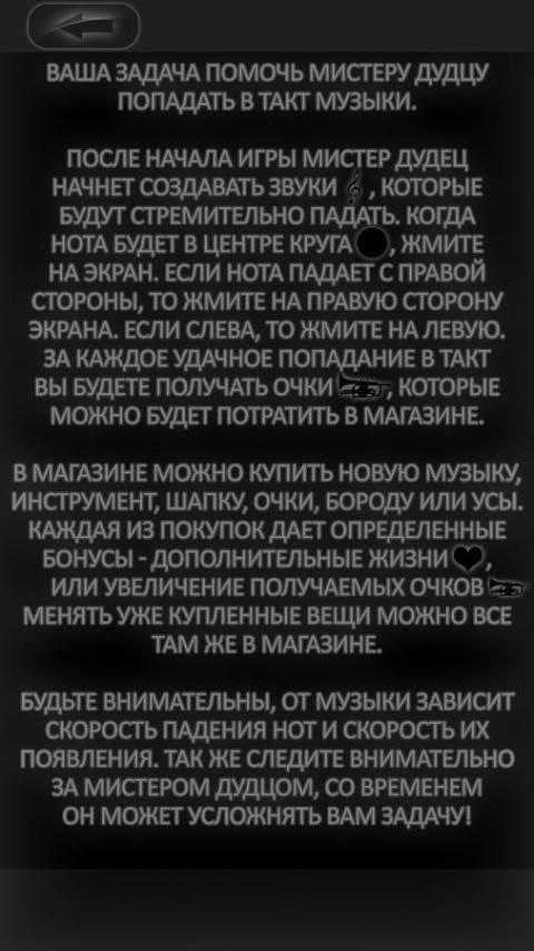 بعد بداية اللعبة تبدأ السيد Dudets لخلق الأصوات التي سوف تنخفض. وعندما تكون هذه المذكرة في مركز الدائرة، انقر على الشاشة. إذا سقطت مذكرة على الجانب الأيمن، ثم انقر على الجانب الأيمن من الشاشة. إذا كان اليسار، ثم انقر على اليسار. لكل ضربة ناجحة للفوز ستحصل على النقاط التي يمكن أن تنفق في المخزن.