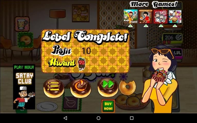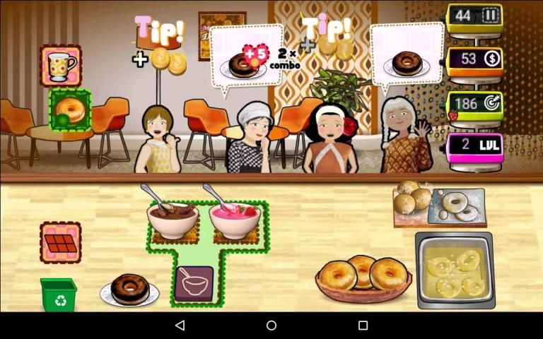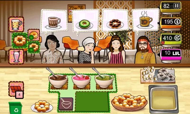 خدمة العديد من الزبائن مثيرة للاهتمام وحريصة التي تأتي إلى حسابك في دونات شوب / مطعم من خلال إعداد العديد من أنواع الكعك مثل ثقب الكلاسيكية في مركز الكعك، برلين، cruller ومستر دونات في بون دي الدائري. يمكنك أيضا تخدم حتى بعض ميلك شيك بارد للذهاب! خدمتهم بسرعة لكسب نصائح كبيرة. تهدئة الضيوف الصبر عن طريق التعاقد مع فرقة موسيقية حية تسمى مهام لتسلية لهم!