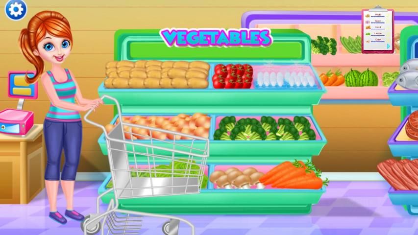 تبدأ في فعل البقالة الخاصة بك في السوبر ماركت مثل الخضروات والفواكه واللحوم وغيرها من المكونات. تدفع في تسجيل النقدية واتخاذ المكونات الخاصة بك إلى مطبخ المطعم الخاص. كما تسوق بعض الملابس السوداء الجمعة في مركز للتسوق في الحصول على الزي الشيف كبيرة.