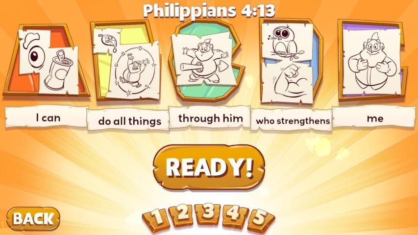تاريخ نوح، أبنائه، وحفنة من الحيوانات الفلك كما تتعلم 25 آيات الكتاب المقدس من العهد القديم والعهد الجديد! يدير كل آية من خلال 5 مراحل من الصعوبة المتزايدة والسماح للاعب لمعالجة وتخزين كل آية في الذاكرة على المدى الطويل.