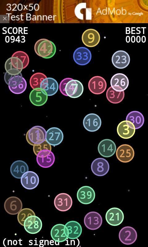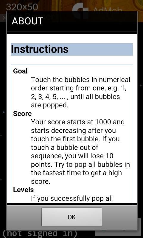 • SCORE: Your score starts at 1000 and starts decreasing after you touch the first bubble. If you touch a bubble out of sequence, you will lose 10 points. Try to pop all bubbles in the fastest time to get a high score.