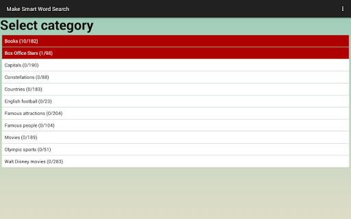 The categories that includes are: "Books", "Box Office Stars", "Capitals", "Constellations", "Countries", "English football", "Famous attractions", "Famous people", "Movies", "Olympic sports".