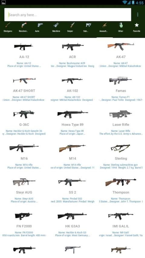 Gun Sounds application comprises awesome and good quality collection of all popular guns including Shotgun, AK-47, Famas, M4A1, Scar H, Tar 21, Fal, M16a4, ACR, F2000, Min Uzi, P90, Vector, Ump5k, Mp5k, L86 Lws, RPD, MG4, Aug Hbar, M240, Intervention, Barrett 50 Cal, Wa 2000, M14/M21, AA 12, sniper along with their sounds. They are currently most popular gun in the world. Real Guns Sounds is one of the best in millions of Guns sounds application on market,It include clear and original sounds from various types of popular firearms. A very simple and amusing app for you or someone else to enjoy.