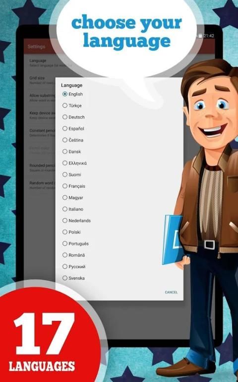 المباراة تأتي محملة مسبقا مع 17 لغة مختلفة وأكثر من ذلك قريبا. كلمة البحث يحدد تلقائيا أجهزتك اللغة الافتراضية ويستخدم هذا أولا، ولكن يمكنك أيضا اختيار من أي من هذه اللغات الأخرى يدويا.