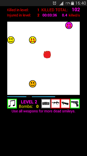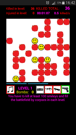 وقد حصلت اللعبة 10 المستويات. من أجل التقدم إلى المستوى التالي لديك لتدمير ما لا يقل عن 100 الوجوه الضاحكة وملء ميدان المعركة التي دمرت الوجوه الضاحكة.