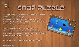 Snap puzzle is a game for the youngest children, around 2-5 years of age. It is about finding the right place, where the figure fits. You drag and drop the figure on top of the black figure that matches. The full version consists of a total of 13 tracks with 65 different figure. The game is developed by Martin Ulisse. This is my first game for the Android market. If you have any kind of commentary on the game, please write to martin@ulisse.dk.