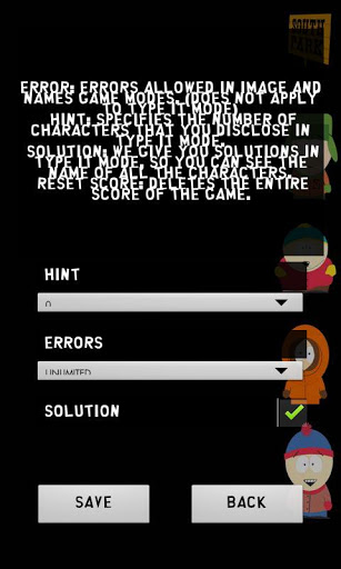 Another great game quiz or trivial to test your knowledge about the famous serie SOUTH PARK.Try the different modes of play and get some help through the quot;Settingsquot; menu suggestions, errors and solution for each characterIncluded INFINITE play mode settingserrorsunlimited Please don39;t rate below 3Please if you find any errors, please email usThank youEnjoy it
