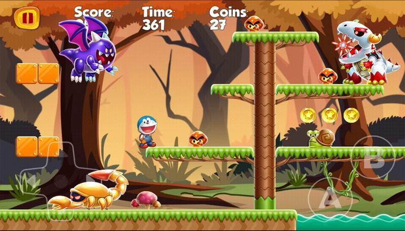 ألعاب عبقور في محاولة للوصول إلى النتيجة كحد أقصى في مغامرته، تشغيل والقفز وهزيمة الأعداء في أرض المغامرة من cula عبة doremon القطط.