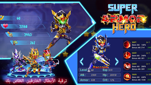- كل بطل خارق لديه مهارات فريدة وأسلحة قوية.