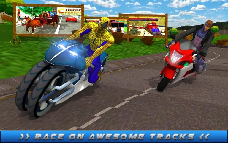 في خارقة لعبة سباق الدراجة سيكون لديك لسباق الأبطال الخارقين أخرى على المسارين. سباق في أماكن مختلفة، ودفع الأدرينالين من خلال خنق المحرك الخاص بك. أداء الأعمال المثيرة على الدراجة وأداء الأعمال المثيرة الدراجة لالتقاط الأنفاس، والهبوط الرائدة في حين السباق. كسب نقاط اضافية عن طريق أداء الأعمال المثيرة وتجاوز منافسيه الدراجة الخاصة بك. هزيمة منافسيه الدراجة الخاصة بك وقرب تفوت عليها وكسب نقاط مكالمة قريبة. كن أول شخص لعبور خط النهاية أو ستفقد اللعبة لأن هذا هو مسابقة من الأفضل عدم ثاني أفضل. ليس هناك مكان للثاني أفضل لاعب.