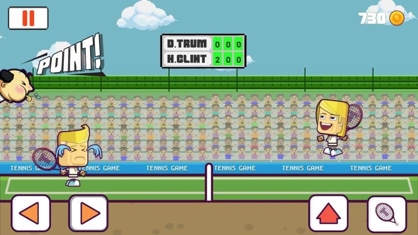 لعب مع جميع اللاعبين الشهير مثل دونالد ترامب، هيلاري كلينتون، وبعض من الشخصيات العادية! لعب التنس هو الكثير من المرح مع الكثير من شكا من السلطة والتحولات مضحك، مثل الخصم الخاص بك وسوف يكون الطفل الصغير صغير في المحكمة. أنت بالتأكيد سوف تحب لعب أساطير التنس!