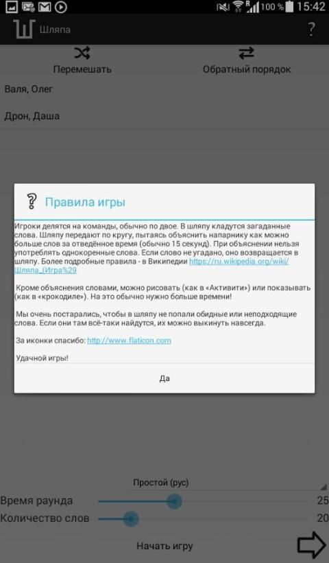 وتنقسم اللاعبين إلى فرق، وعادة في أزواج. في قبعة وضعت كلمة المخفية. يتم تمرير قبعة حولها، في محاولة لشرح لشريكه قدر الإمكان في الوقت المحدد، والكلمات (عادة 15 ثانية). في شرح المستحيل استخدام نفس الكلمة الجذر. إذا لم يتم خمنت كلمة، فإنه يعود إلى القبعة. قواعد أكثر تفصيلا - ويكيبيديا.