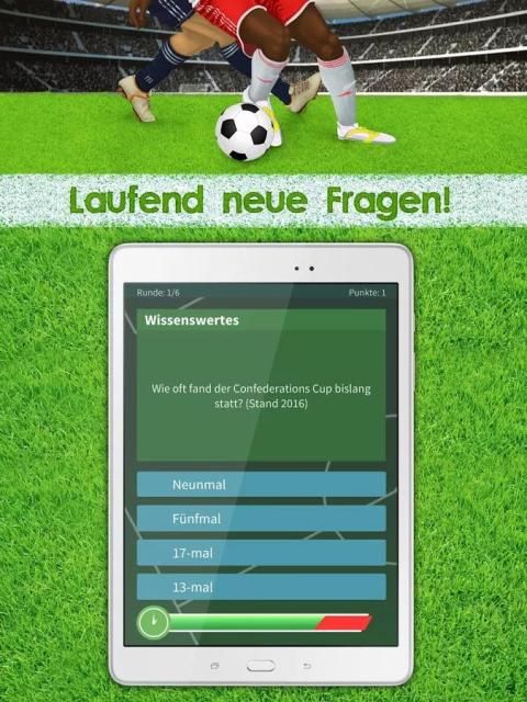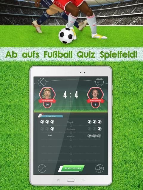 التطبيق مسابقة إلزامي لجميع مشجعي كرة القدم! تحدي أصدقائك واللاعبين في جميع أنحاء العالم الاصعب من وإثبات معرفتك المحيطة بطولة كرة القدم، كأس العالم، الدوري الالماني، قواعد كرة القدم والأندية ودوري ابطال اوروبا وعلى كل ما له علاقة مع الكرة المستديرة على العشب الأخضر!