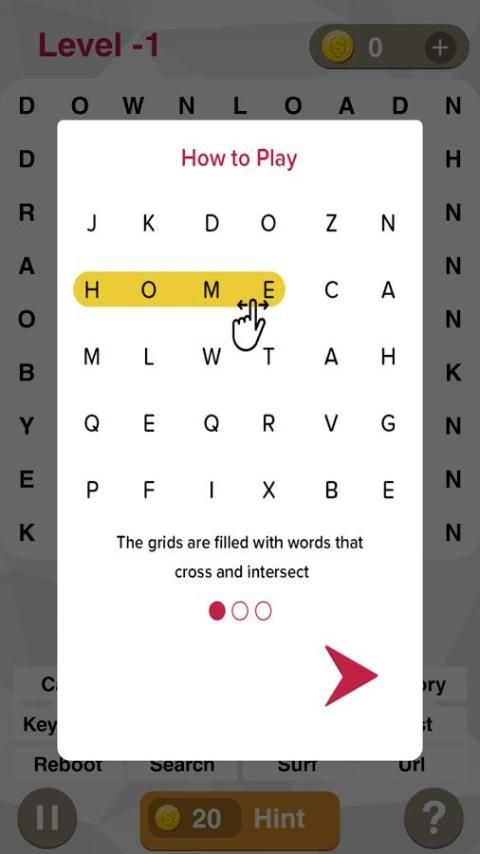 - مرر إصبعك أفقيا، رأسيا، قطريا، إلى الأمام أو إلى الخلف للعثور على الكلمات مخبأة محددة في المزج بين الأحرف.
