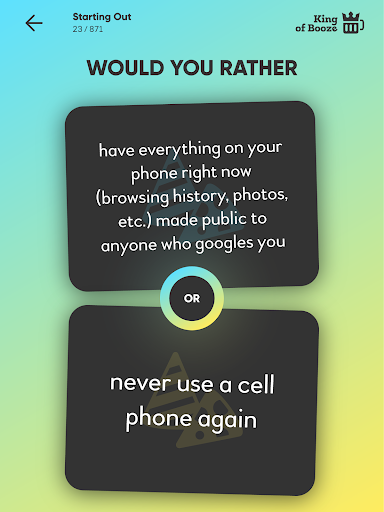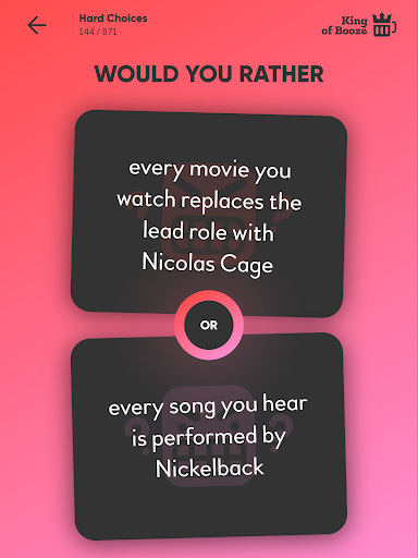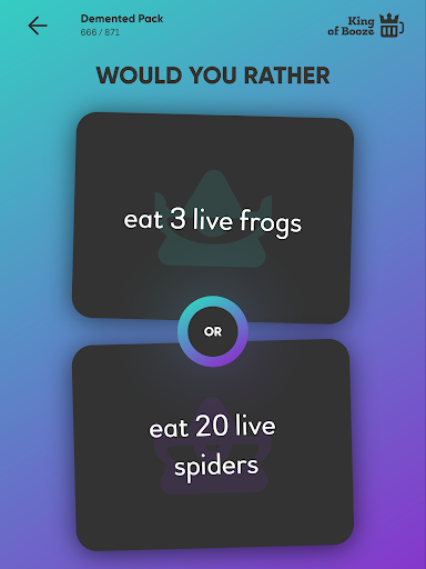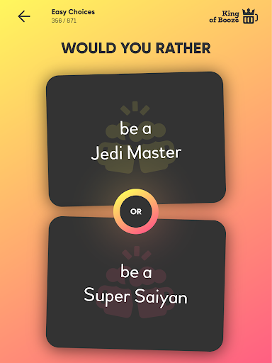 هل تفضل لعبة مضحكة يمكنك اللعب مع أصدقائك وزملائك في الدراسة.هل تفضل أن تضم 850 سؤالا حيث يجب عليك القيام بخيارات مستحيلة.جميع الأسئلة في الألعاب لها نفس هيكل الجملة "هل تفضل أن تفعل أو ب؟".بمجرد أن تختار اختيارك، يمكنك أن تطلب من أصدقائك أن يختاروا.إنها لعبة مثالية للحفلة مع البالغين.