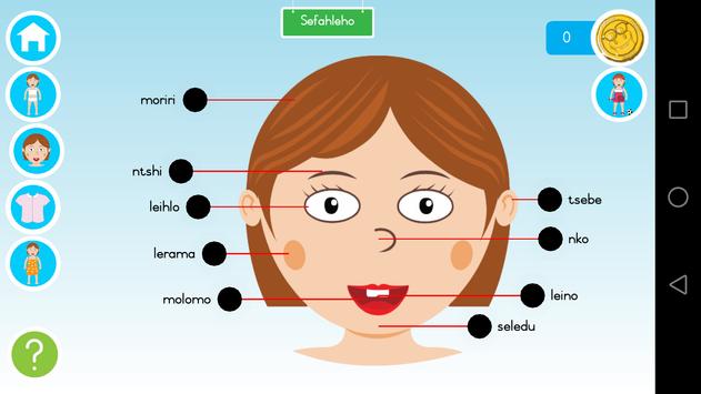 Sotho Wardrobe هو تطبيق Sotho التعليمي للأطفال الصغار الذين يعلمهم الأسماء (والنطق) لأجزاء الجسم المختلفة والملابس والطقس.