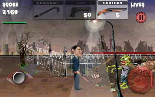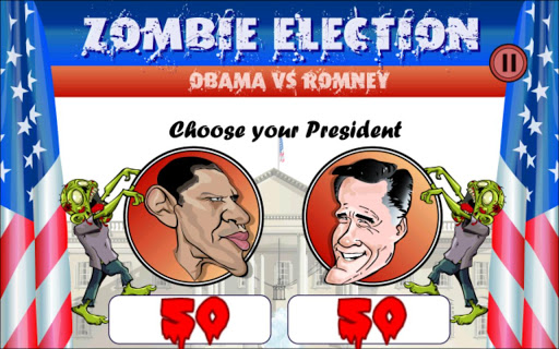 The zombie election 2012 is coming Choose your president, Barack Obama or Mitt Romney, and lead him to the white house.The journey will be very perilous as you will have to fight a horde of zombies, and face some various scary creatures The election 2012 live stats are available to determine which president is most chosen by the players.For the zombie election 2012, you must first make your choice on which president you want to play with, Obama or Romney.That will influence the zombie election live stats on which future president is most chosen by players.The result will be displayed live in the game and on our developer website.Your only friends are your 3 weapons, a crowbar, a gun, and a shotgun. Just tap on the icon to change your weapon.To reach the white house, you will have to across three deserted areas, abandoned after a nuclear disaster.You will have to fight for your life and survive to a horde of fierce zombies, giant mutant rats, carnivorous plants, green hornets and more Use your bullets carefully as they are limited Fortunately a helicopter from the US army will drop you some ammo at some times to help you survive in this hostile environment.It will also bring some special shield that will protect you from danger for a few seconds, and some recovery medicine that will increase your energy.This game will knock you out with intensive action gameplay and amazing parallax HD graphics.The great soundtrack and sound effects also magnify the horror and desolation of the atmosphere. Make sure you visit our developer website to track the progress on how many people choose Obama or Romney and see who will win the zombie election 2012 The game is totally FREE, so please do not complain if it contains some advertisements.If you don39;t like the ads, please buy the adFree version.