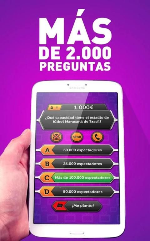 تلعب رغبة تتردد في أن تكون مليونيرا؟ في الإسبانية وتظهر للعالم الذي هو العبادة. هذا التطبيق هو لعبة الأسئلة والأجوبة باللغة الاسبانية مستوحاة من البرنامج التلفزيوني الشهير الذي يريد أن يكون مليونيرا. تماما مجانا! المنافسة يحتوي على أكثر من 2000 سؤال الثقافة العامة وضعين في المباراة التي يمكنك اختبار الذكاء لديكم. ما ستعرف!