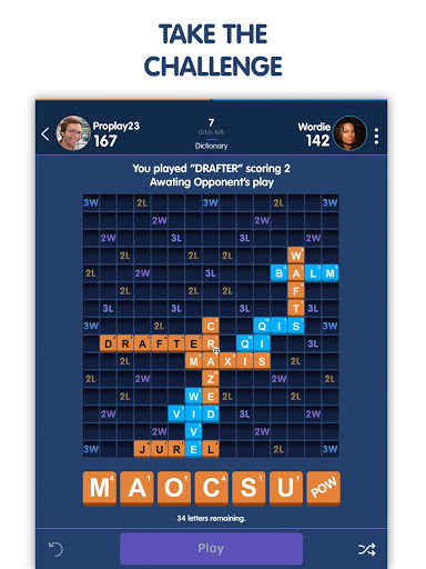 This is further enhanced by a challenge mode in which the POW dictionary is disabled and it is up to players to challenge their opponents' word for validity or play on and accept it. Dictionary mode has POW adjudicating word validity using the built in dictionary. Words are only revealed once each player has locked in their word. Players accumulate points for each word played, with only the highest scoring word remaining on the board.