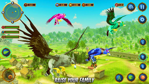 The incredible flying eagle griffin simulator is a captivating bird experience designed for all enthusiasts of flying griffins and mythical creatures. Your responsibility is to nourish your family by hunting and ensure their survival by guarding them against predatory animals in the jungle. When you and your family feel thirsty, venture through the jungle as an eagle simulator to find water. Take care of your young ones as they are too tender to fend for themselves in these Flying Horse - falcon games.