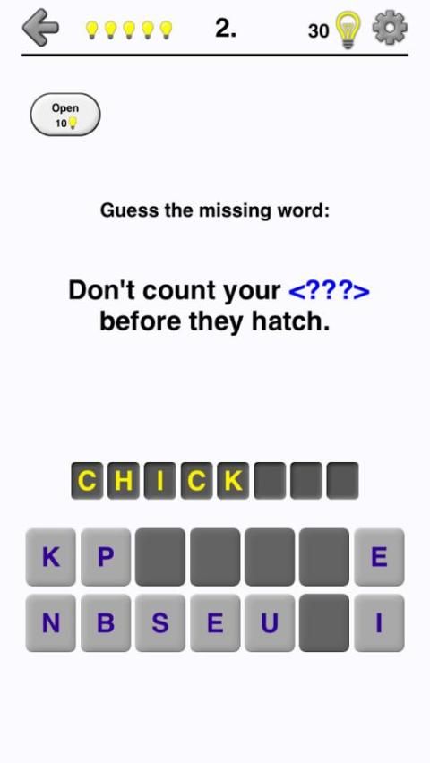 تخمين كلمة المفقودين وإنهاء 200 الأمثال الإنجليزية والتعابير، مثل: "إن *** يوم الحفاظ على الطبيب بعيدا" أو "الحفاظ على أصدقائك وثيقة وبك *** أقرب".