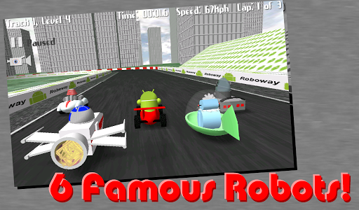 Andy the Android robot and his friends have hit the roboway to go racing! Compete robot to robot in this high speed kart racing game. As you move up levels, more and more robots are added to the race until all six are racing. The game comes with 18 tracks: 12 prebuilt and 6 you can build yourself. Five different powerups are available along the way to help you compete at the higher levels. With a 3D phone or a pair of red/cyan 3D glasses, race in stereoscopic 3D!