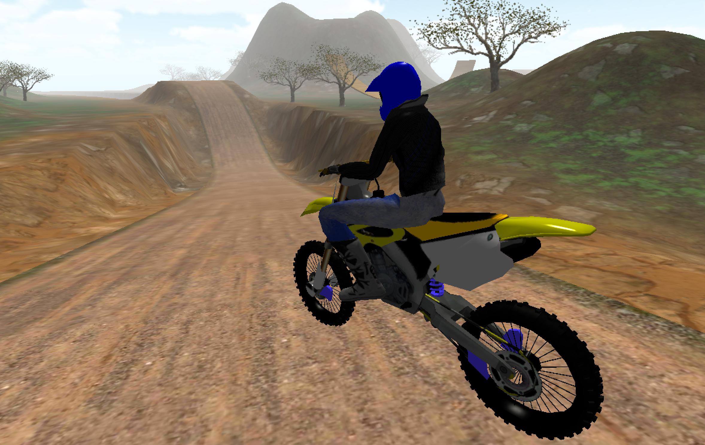 With this free motocross racing game simulator you can drive on a extreme long rally road or explore jumps and big off road hills! The game has a huge open world environment with mountains, hills and a long rally road. Jump high and earn points for your new best high score. Perform crazy jumps with full speed or crash with the two other motocross driver opponents in this free game. If you like motocross games this will be your new favorite motorbike simulator game.