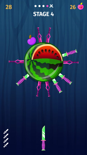 Throw the knifes into the logs to break them. Slash the apples and unlock new knives. Each 5th stage is defended by a boss - beat them to get exclusive knifes!