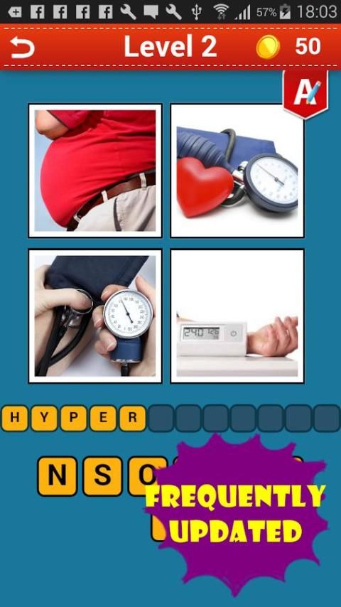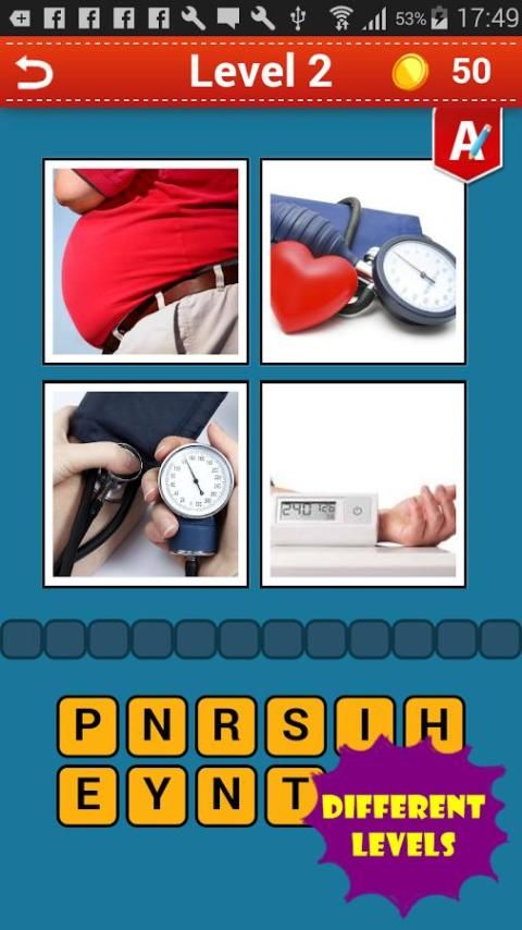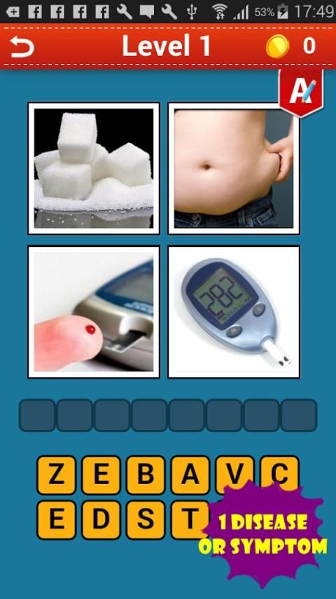 4 صور 1 الأمراض غير كلمة وصورة لعبة حيث لديك لتخمين مرض أو أعراض وصفها في 4 صور، وهذا هو اختبار لاختبار الذاكرة الخاصة بك ومهارات المفردات.