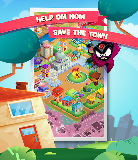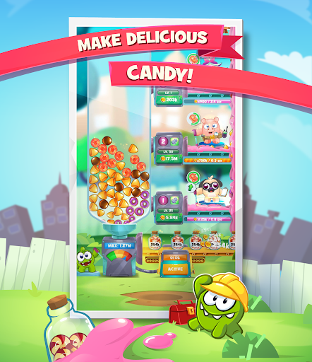 om nom هنا ويحتاج إلى مساعدتك في بناء أكبر مصنع للحلوى في العالم!