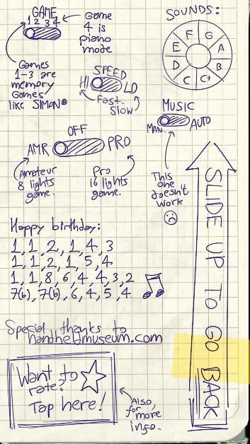 بيضة عيد الفصح: إذا كنت تلعب عيد ميلاد سعيد بينما كان في وضع البيانو (1،1،2،1،4،3،1،1،2،1،5،4،1،1،8، ستظهر 6،4،4،3،2) على الزر الأصفر. إذا كنت تحمل عليه، يتم خفض مستوى كافة الملاحظات تضغط من نصف خطوة (حتى زر 3 سيلعب E ♭ بدلا من E).