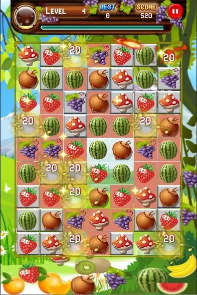 الحصول على نقطة بمحو الفواكه. يمكنك إجراء سلسلة طويلة من الفواكه للحصول على المزيد من النقاط!