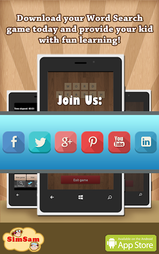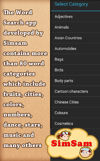 كلمة البحث التي وضعتها Simsam التطبيق يحتوي على أكثر من 80 كلمة فئات التي تشمل الفواكه والمدن، والألوان، والأرقام، والرقص، والنجوم والموسيقى وغيرهم كثير كثير. وعلاوة على ذلك، ونحن نقدم 3 مستويات من الصعوبة - وإذا ابنك لا يمكن أن تحل الشبكة انه / انها يمكن بسهولة انتقال إلى المرحلة التالية. كما نقدم الكلمات في لغات مختلفة، مما سيضاعف التطبيق كأداة لتعلم اللغة كذلك!